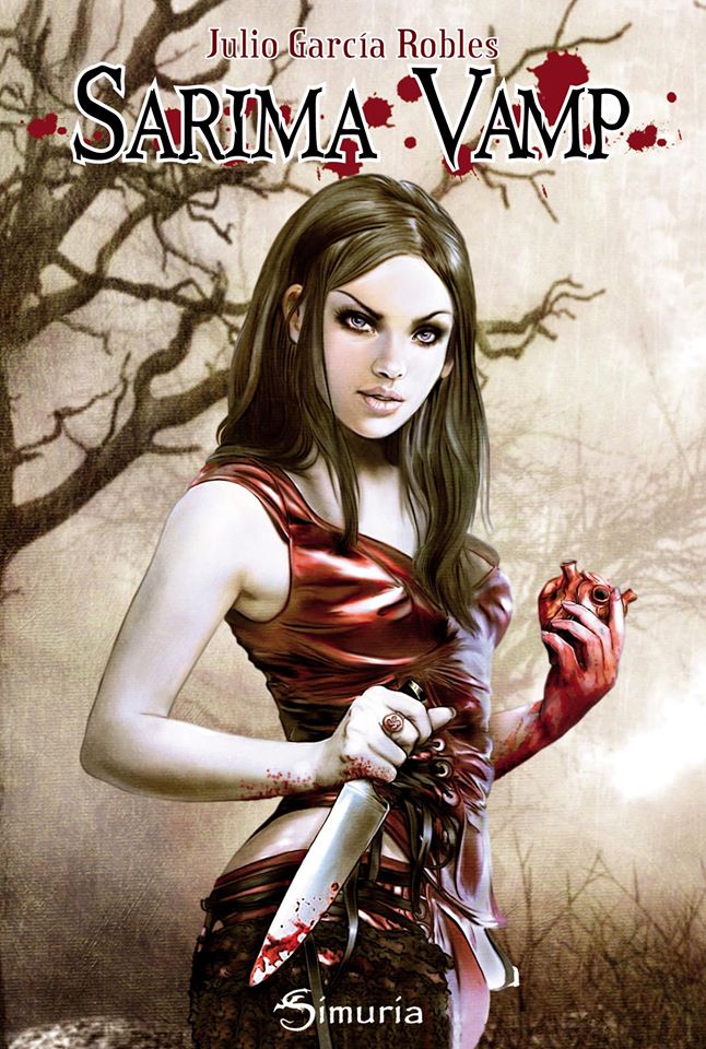 Tras esta breve introducción, nos centramos de nuevo en Sarima Vamp. En primer lugar, la vistosa portada es obra de la propia Sarima (Marisa Lopez Moreno) y en ella vemos a la protagonista sosteniendo un sangrante corazón en una de sus manos y un cuchillo en la otra. Con esa piel pálida y esa expresión siniestra, la composición nos da las primeras pista sobre la obra. Genial ilustración, llamativa y sugerente. Además, la cubierta en sí es una ilustración completa.