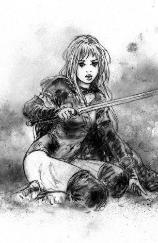 En primer lugar hemos de detenernos en esa increíble portada. Pura magia. En ella podemos ver a Luna y asombrarnos de su dualidad. Una joven frágil, superviviente de un mundo que se resquebraja, y a su vez, tremendamente decidida. Es una imagen que nos acompañará durante toda la novela e iremos comprobando si es tan frágil o cuáles son sus motivos para luchar. Aunque no es la única ilustración que nos irá guiando por la novela. En el interior de la obra, podremos degustar bastantes ilustraciones a trazos, enérgicas, en grises,… que acompañan fielmente al texto y a la atmósfera que se genera al sumergirnos en la historia. Las manos de Luis y Rómulo Royo nos regalan unas imágenes desgarradoras realizadas por sus mágicas manos.